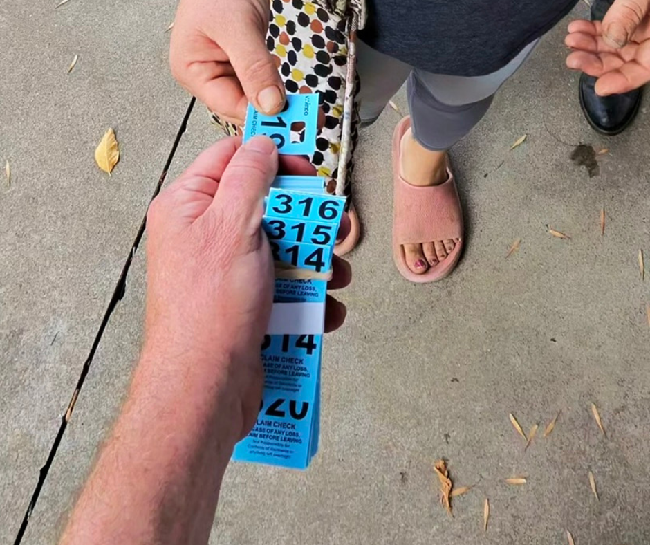 When we have enough food to go around, we try to give each resident at Tent City enough food bags for each person to have one per day until we return. While this hardly meets their nutritional needs, each bag will have a protein, such as a tuna pack or can of Vienna sausages. Then, a pack of peanut butter crackers, oatmeal, Ramen noodles, a cereal bar, a fruit cup, apple sauce, and a treat, such as a Little Debbie snack. When available, we also give the residents at Tent City essential hygiene items, including wipes, used shoes, socks, and totes to help keep their belongings dry and away from rodents and insects. And then plenty of drinking water. Also, odds and ends, such as a purple suitcase that someone donated. That was quickly abducted by one of the residents and used for transport provisioning. We’ve had tattered firefighters’ suits and a duck blind donated that were more desired than I would’ve thought.